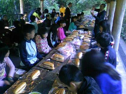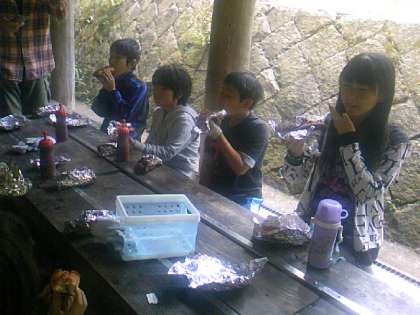 第2炊飯場で,朝食のパックドッグ作りに挑戦です。パンにソテーしておいた野菜とソーセージをはさみアルミホイルで包みます。それを牛乳パックに入れたまま,火をつけます。牛乳パックが燃える熱で,程よく焼けたホットドッグが出来上がります。