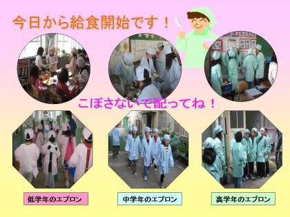 今日から給食が始まりました。エプロンを着て給食の準備です。低学年のエプロンの色はピンク,中学年は水色,高学年はPTAから買っていただいたグリーンです。給食当番はこぼさないように気をつけながらの配膳です。今日の給食の献立は「ごはん,牛乳,すきやき風煮,たたきごぼう,りんご」です。みんなとてもおいしそうに食べていました。