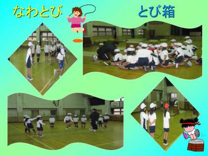 今日の2年生の体育では,長いひもを使ってのなわとびです。長縄を使ってのなわとびは今日が初めて・・・でもがんばってとんでいました。その後はとび箱です。とび箱と踏み切り板の間に距離調節器を入れてとびました。みんながんばってますね!!