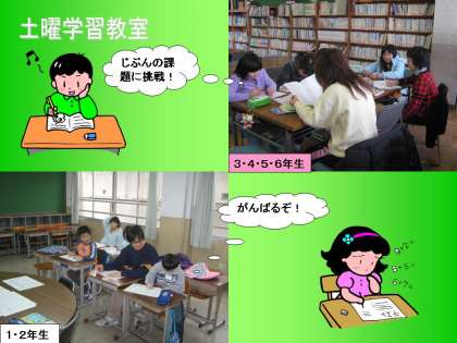 朝のAM9:00から土曜学習教室を行いました。1・2年生は多目的室,3〜6年は第1図書室です。みんな自分の用意した課題に挑戦したり,計算・漢字プリントをしました。みんな静かに熱心にやっていましたよ!よくがんばりましたね。