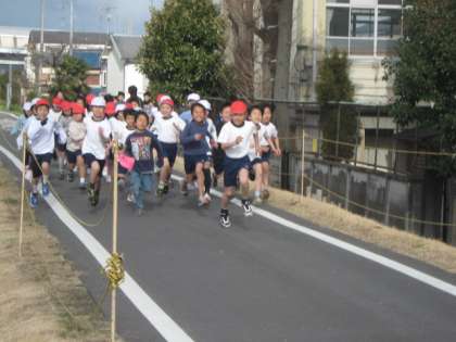 体育では来週に行われるマラソン大会に向けて練習をしています。校区にサイクリングロードがあるのでそこで練習をしています。まさに校区が学校です。がんばれー!!