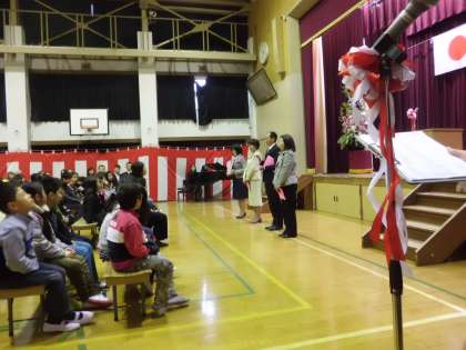一年生は、最初は少し緊張しながら校長先生のお話を聞いていましたが、みんなとても立派な態度で式に参加していました。式では、二年生の子どもたちも、お兄さん、お姉さんらしくお迎えの言葉を発表してくれました。