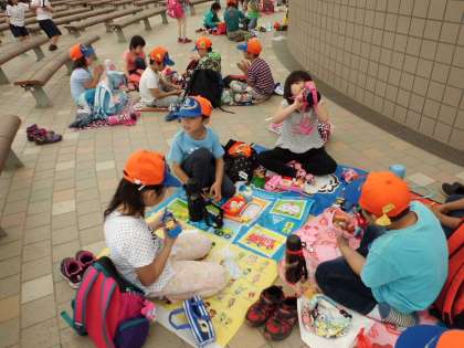 昼食では、みんなおいしそうにお弁当を食べていました。みどりの広場には,大きなアスレチックやすべり台などもあり,子どもたちは元気いっぱい遊びまわっていました。