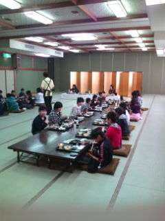 今,朝食を大広間で食べています。これもまたごうかな朝食メニューです。みんなおいしそうに食べています。