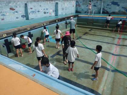 プール掃除を行いました。2時間目は5年生、3時間目は6年生が行いました。天気も良く、絶好のプール清掃日和でした。