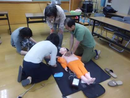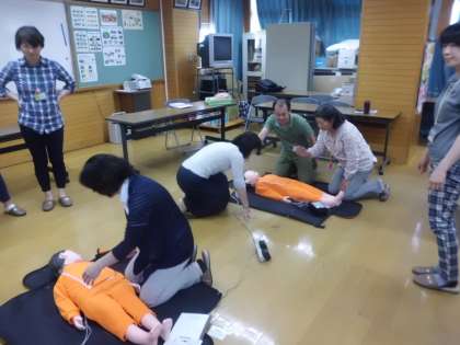「緊急時の対応マニュアル」というDVDを視聴した後、人形を使って心肺蘇生法を実際に行いました。その後、AEDを使った講習も実施しました。