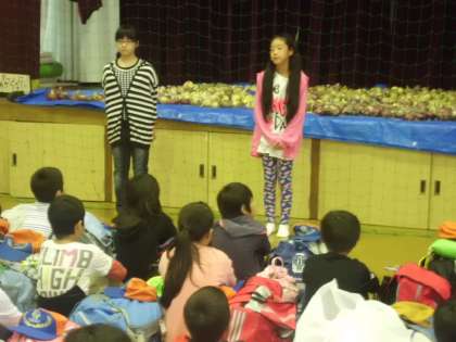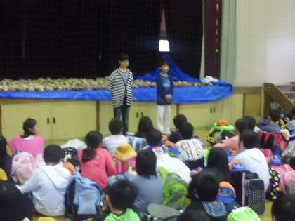 いよいよ今日から、花背山の家の野外活動が始まりました。学校では、8時40分から体育館で出発式を行いました。司会や係の人が、大きな声でお話をしてくれました。