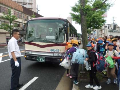 8時50分に学校を出発して、9時ごろガスタンク前から京都バスに乗って、花背山の家に向かって出発しました。