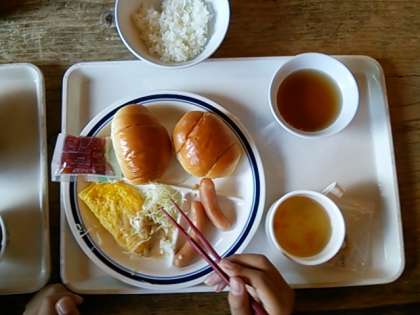 2日目の朝食は、食堂でバイキングです。オムレツ ウインナー れんこんの天ぷら サラダ パンかごはん みそしるかコンソメスープなどを自分で選択できます。