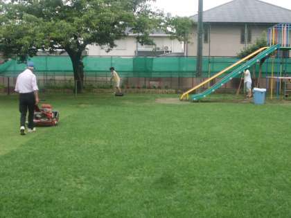 7月に入って最初の芝刈りを実施しました。約2週間ぶりの芝刈りでしたが、芝はコアリングから順調に生育しているとのことでした。最後に、芝生用の肥料を散布しました。