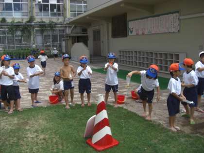 ケチャップやマヨネーズの空き容器を利用して,水をたっぷり入れて「的あて」や「飛ばしっこ競争」をします。インターロッキングでは,水でかいたにこにこ笑顔が飛び出しました。どうすれば遠くに飛ばせるかな,うまく的に当てるにはどうしたらいいのかなと考えながらも,最後にはお友達の背中に・・・。燦々と照る太陽のもと,とっても楽しい時間になりました。