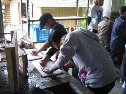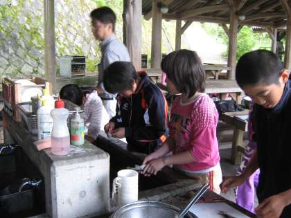 午前中につかんだイワナのさばき方とくし打ちの方法を教えてもらいいざ挑戦!魚をさばくのに悲鳴をあげる子,気持ち悪がる子が多かったのですが教えてもらったことができると「やったー」と満足感をおぼえる子が多かったです。はじめにおなかを開いて内臓をとって中身を水洗いしました。