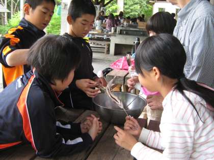 中身を洗ったらくし打ちです。ちょっと難しくなかなかくしが通らなかったけど,みんながんばりました。それに塩をふって炭火焼です。どんな味なのかな?