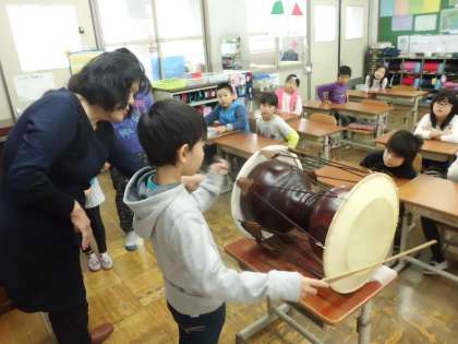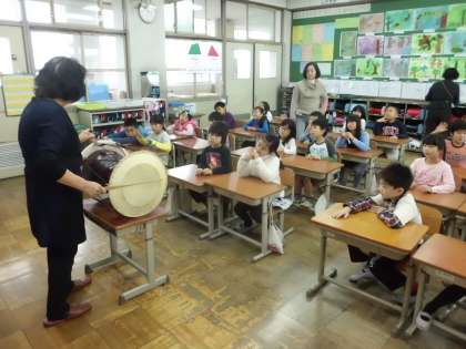はじめに,チャンゴという日本の鼓に近い楽器を一人ずつ演奏しました。両手に種類の違うバチを持ち,みんな上手に演奏していました。