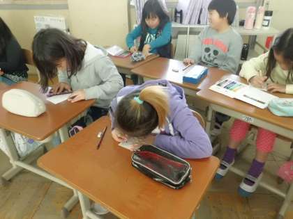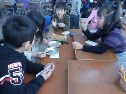 4時間目に栄養教諭の先生に食の学習をしていただきました。毎日美味しい給食を作って下さっている給食調理員さんへ,また私たちの力や栄養となっている命の恵みに感謝の気持ちを込めて俳句を作りました。中にはお気に入りの献立にちなんだ俳句を書いている子どもたちもいました。最後にはお箸の持ち方を確認し,班で豆つかみ大会も行いました。