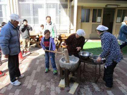 おもちを食べるだけでなく,多くの子どもたちがもちつきの体験をさせていただきました。