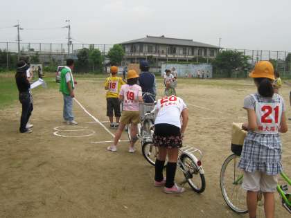 今日,4年生以上の子ども達は第2運動場で自転車教室を行いました。伏見警察署から交通巡視員の方から乗り方の説明を聞いた後,ゼッケンをつけて実地テストです。テストの採点はPTAの補導部と交通安全推進委員会の方々です。みんな少し緊張した様子でしたが最後まで全員ががんばりました。正しい乗り方をおぼえましたか?