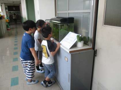 職員室前の廊下にメダカの水そうが設置してあります。メダカの学習は、5年生で習いますが、水そうは全校児童が見られるように廊下に置いています。