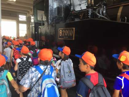 鉄道博物館の最後にみんなで、蒸気機関車庫を見学しました。たくさんの蒸気機関車を間近で見れました。