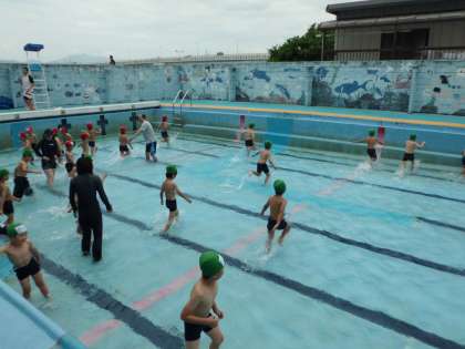 今日は低水位で,1年生の水慣れがありました。1年生は初めての小学校のプールにわくわくドキドキでした。