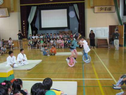 3組(育成学級)はハンドベルでキラキラぼしの演奏。(写真左)2年生は自分の名人芸(写真右)を1年生に見せました。