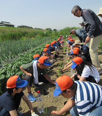学校の西側を流れる桂川の河川敷の畑で,地域の方々にお世話になり,野菜を育てています。連休明けの5月8日には,4年生がきゅうりと茄子の苗の植え方を教わりました。たっぷりと水を含ませた土の中に,1本1本丁寧に苗を植えました。