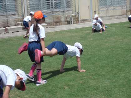 3年生の「体ほぐしの運動」では,フラフープを使ったり,馬跳びや手押し車など友だちと触れ合いながら,楽しく運動しています。