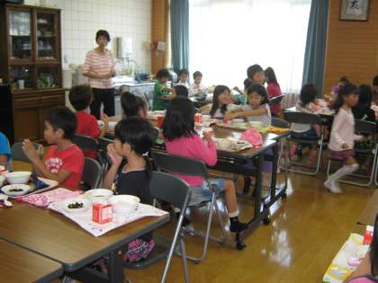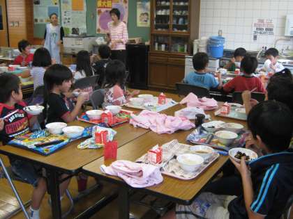 2年生が小学校にある陶器の食器で給食をふれあいサロンで食べました。教室とはちがった雰囲気に子ども達は大はしゃぎです。みんなおいしそうに食べていました。