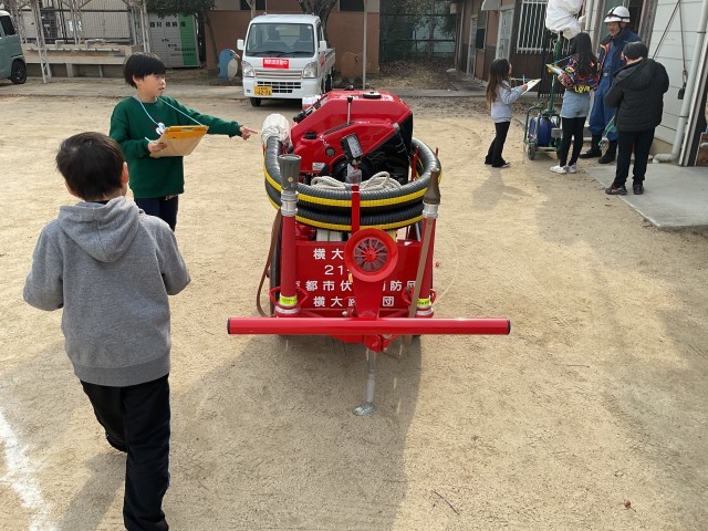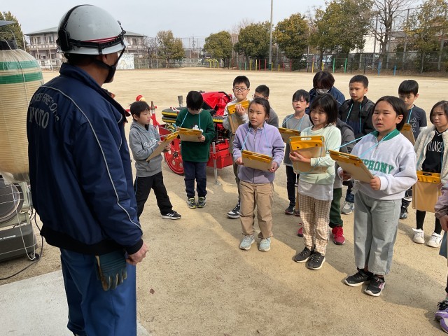 今日は社会科の学習で地域の消防団の方にお話を聞かせていただきました。倉庫の見学もして、いろいろな道具の使い方も教えてもらい、とても勉強になった1時間でした。子どもたちはみんなのために活動している消防団の方のお話を聞いて、「自分も人を助けられる、強い人になりたい」と振り返っていました。