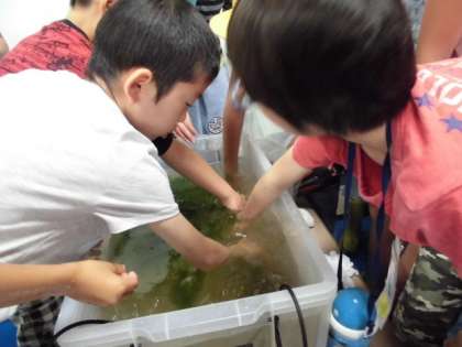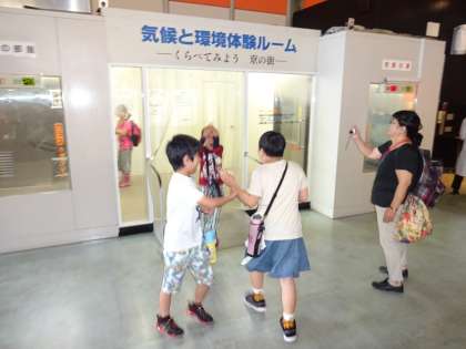 最後は,みんなそろっての展示学習でした。生き物コーナーでは,ザリガニやイモリ,ドクターフィッシュなどを触ることができました。京都の蒸し暑い夏と砂漠のカラッとした暑さを体験できる部屋もありました。まだまだ見学したり体験したりしてみたいコーナーがありました。様々な不思議に触れるよい体験となりました。