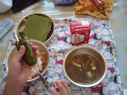 ランチルームで給食をいただきました。献立は,玄米ごはん・もずくの味噌汁・もやしのごまいため・セルフおにぎりの具(梅鮭)・手巻きのり・牛乳でした。ごはんにおにぎりの具を混ぜて,手巻きのりで巻いて自分でおにぎりを作って食べました。