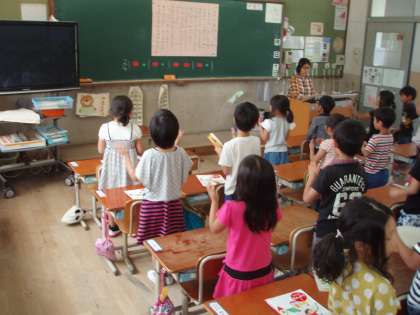 「さんぽ」と「白くまのジェンカ」の歌を学習しました。「さんぽ」の歌は,振り付けをつけて踊りながら歌いました。今回は,1番の歌の振り付けを覚えました。「白くまのジェンカ」では,「タン,ウン,タン,ウン,タン,タン,タン,ウン」のリズム打ちをしながら歌いました。打楽器も打ちながら楽しく歌いました。