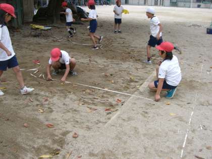 とんだきょりを計るまきじゃくにちょっと苦戦(くせん)。