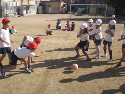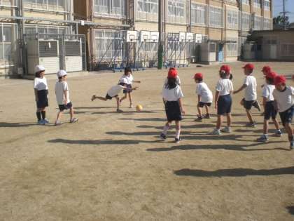 ころがしドッヂボールも最後の時間になりました。「ボールをとったらすぐに早く投げる」ことを目指してがんばりました。後半は対面形式で,本当のドッヂボールにつながるようなスタイルでやってみました。終わったときには,もっと「やりたい〜。」という声が。また,休み時間にチャレンジしようね。