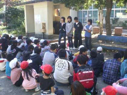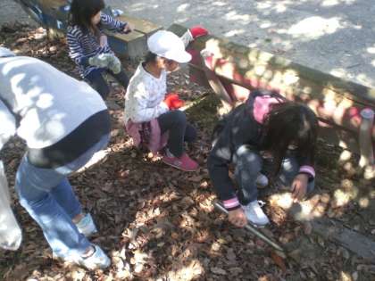今日は6年生との「なかよしグループ」で下野公園の清掃活動に取り組みました。6年生が指示をだして,1年生と一緒に落ち葉やゴミを集めました。さすが6年生です。1年生をうまくリードして頑張りました。1年生もうれしそう。最後には「たくさん集められて楽しかった。」という感想が多く聞かれました。