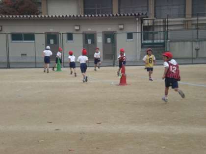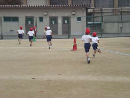 後半の「かけあし」。3分間走をしています。現在一番早い子で660Mを走ります。持久走記録会は1000M。まだまだです。