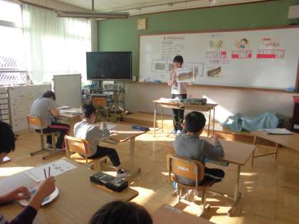 最初は,知っている魚の名前を発表し合いました。給食でよく食べている「さば」や「さんま」などが挙がってきました。つぎに,魚パズルをして,魚の体のつくりについて知りました。そして,魚には,骨や歯をつくる・血や筋肉をつくる・血をサラサラにするはたらきのある栄養がたっぷりあることを知りました。最後に,魚を上手に食べる方法を模型を使って練習しました。早速,この日の給食「いわしのしょうが煮」のいわしを食べる時に,おはしを使って骨から身を取りながら,上手に食べることができました。