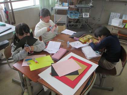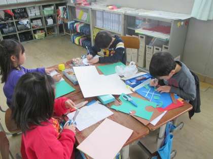 今日は,いろいろな色の画用紙を用意し,その中から自分の作りたいものに合った色を選び,作品作りを進めました。「弟のために,いないいないばあの作品を作りたい」など,それぞれが気もちを込めて作品を作っています。
