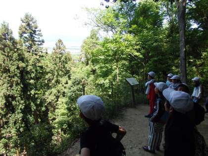 険しい道も,長い道のりもみんなで登ればへっちゃら。「がんばれ。」「もうちょっとだよ。」と励ましの声がたくさん聞こえてきました。登山の途中で見えた,京都市内の上からの景色に思わず「ヤッホー」とやまびこをしていました。千人塚の近くでは,なんと野生の鹿に出会うことができました。