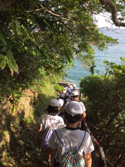 午後、芝生広場で遊んだ後、潮が引くタイミングで宮崎浜に行きました。宮崎浜に着いたら,マリンランドの所員さんから磯の生物のお話を聞きました。