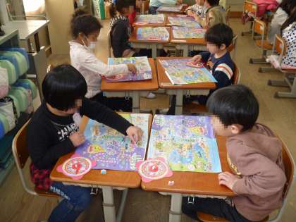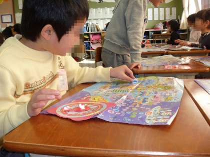 ふろくのすごろくで遊んでいます。1〜100まで上手に数えながらあがります。負けたことが悔しくてすねてしまう子も。でも,楽しかったです。