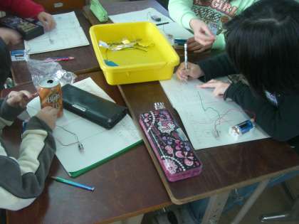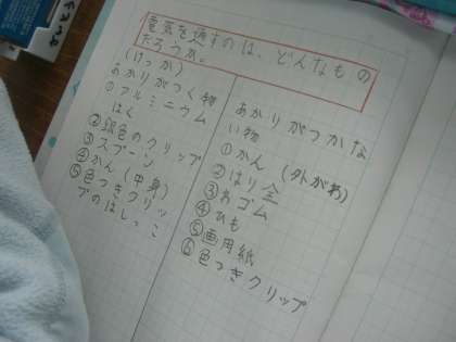 身の回りの様々な物を回路にはさんで、豆電球のあかりがつくのか調べると、