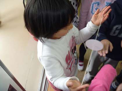 びゅんびゅんごまを一生けん命練習していた子が,見事に回すことができました。何度も何度もねばり強くやってたのですごいと思います。