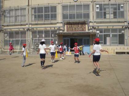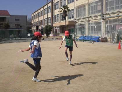 暖かい日差しの中,縄跳びを楽しんでいます。今まで,できなかった跳び方に挑戦したり,今できる跳び方で連続回数に挑戦したりしています。