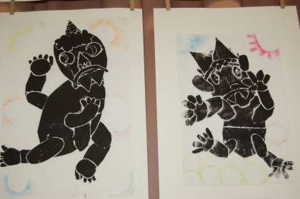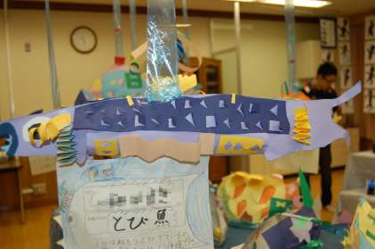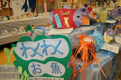 2年生は,カッターナイフをはじめて使いおさかなを作りました「わくわくお魚」と紙版画の「大工とおに六」です。