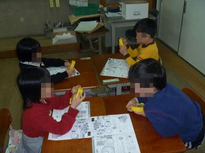 今年から1年生で時計の学習をしています。何時,何時半はすでに言えるはず?!ですが,何時何分まで理解できるようにがんばっています。お互いに「なんじなんふんですか?」と問題の出し合いをしています。