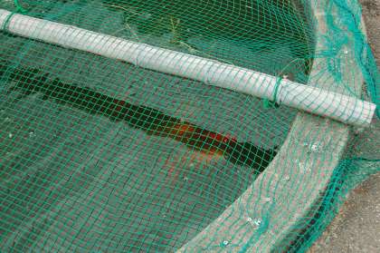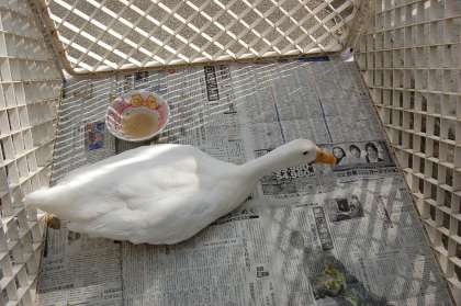 合鴨のクーちゃんです。鳥小屋を掃除してもらってる間,ここで待っています。ひょうたん池の金魚や鯉は水温が低いため,まだまだ出てきません。
