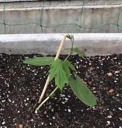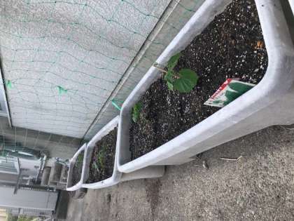 牛乳パックに種をまき,発芽したツルレイシをプランターに植え替えました。太陽の光をいっぱい浴びて,どんどんツルを伸ばし,元気に育ってほしいと思います。