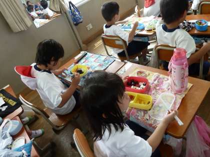 午前の部で「ちゃあびらさい」や「キラキラポン(玉入れ)」をがんばった1年生のみんな。美味しいお弁当を食べてパワーを充電!午後もがんばりました。
