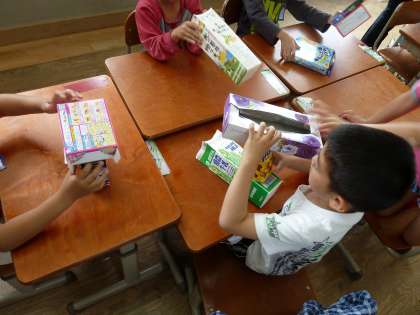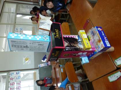 丸や四角の色々な形の箱を使って,動物や乗り物を作りました。グループで協力して話し合いながら,「空飛ぶジェットきりん」,「船」,「空飛ぶ京都タワー」などにチャレンジ!素敵な作品ができました。